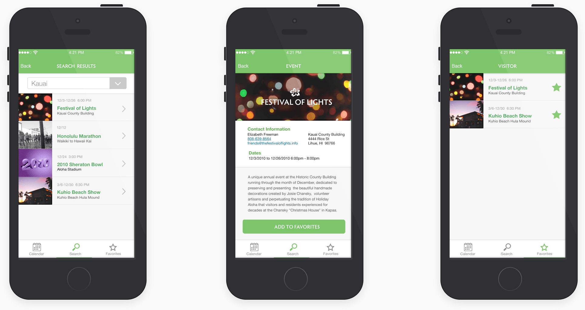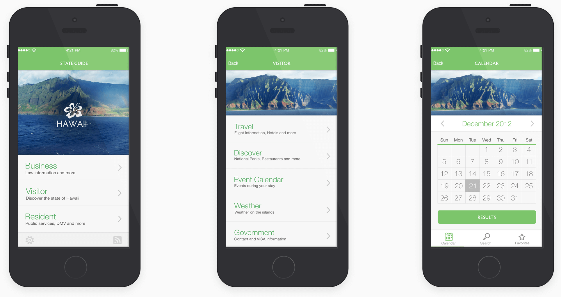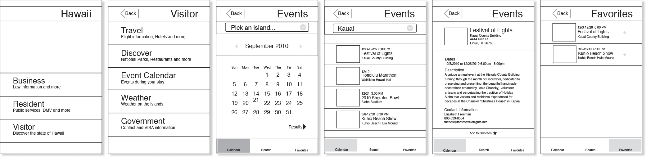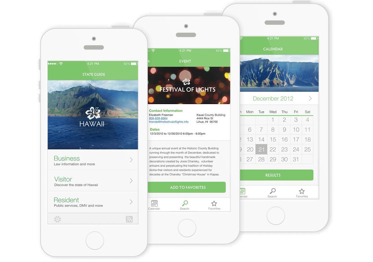 The final design shows the tourist user flow of finding out what events are happening during specific dates. It was important for the interface to be simple and only show the most relevant information. Also, the design was to reflect professionalism and the state’s essence.