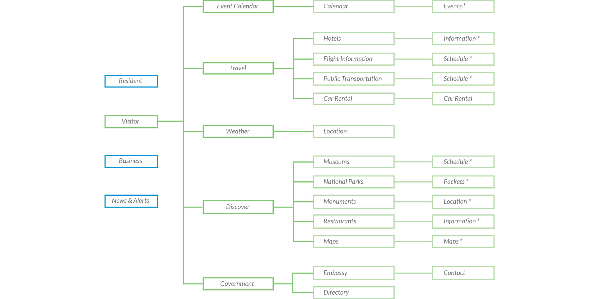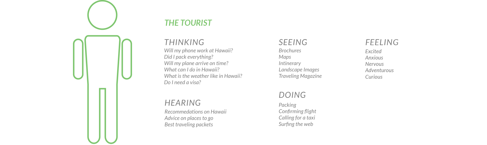 After evaluating current state websites, I identified three main users: tourist / visitor, business and residents. I decided to focus on the tourist who searches to explore Hawaii. I conducted interviews and observed common themes that the user found important to know when visiting a new location. Below is an empathy map of some of the key points of the tourist user group. It was important to create a flow diagram as a starting point for the design. It allowed me to establish, based on my research, what information must be presented in the mobile app. From this flow diagram, I created wireframes for a specific flow. I conducted usability testing before designing the final app.