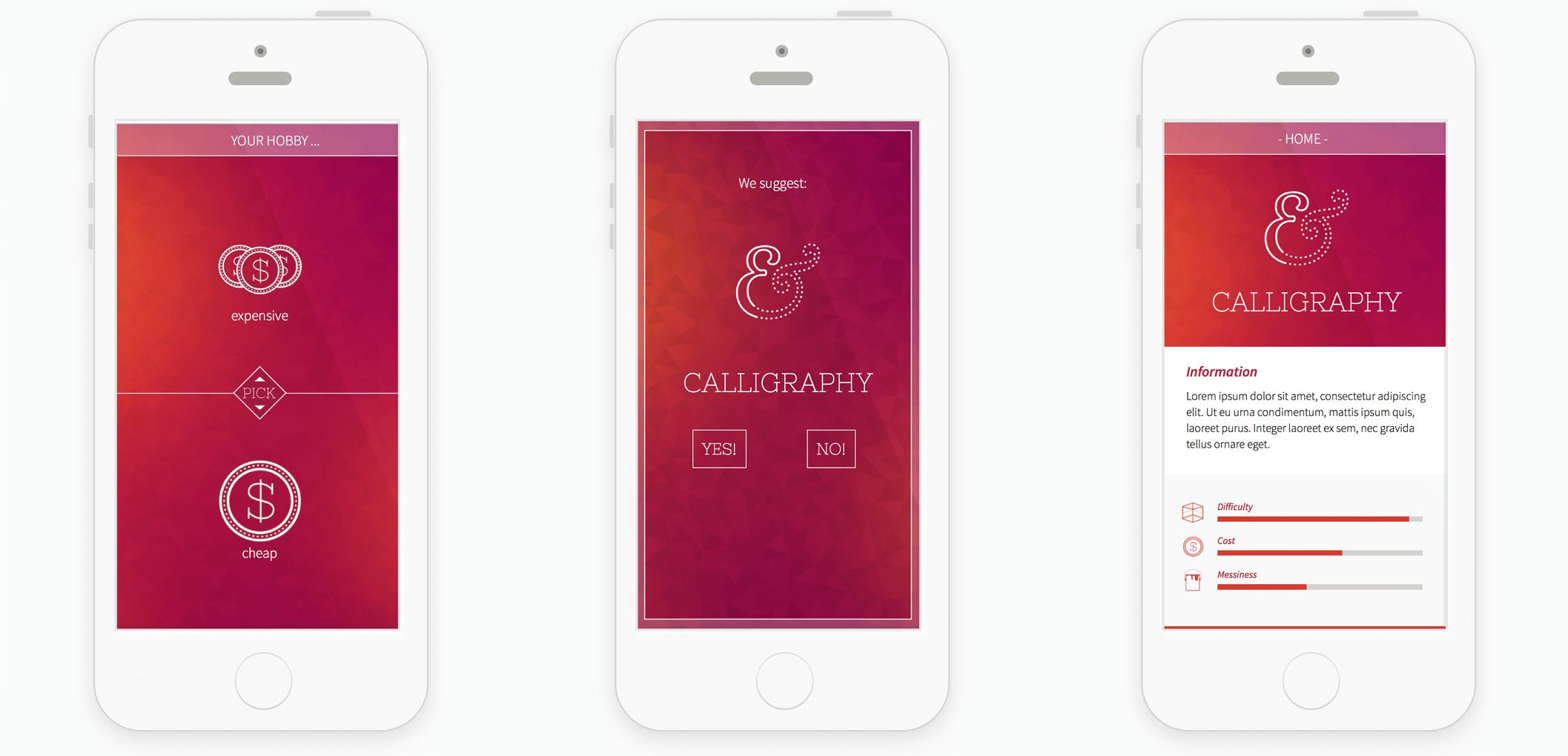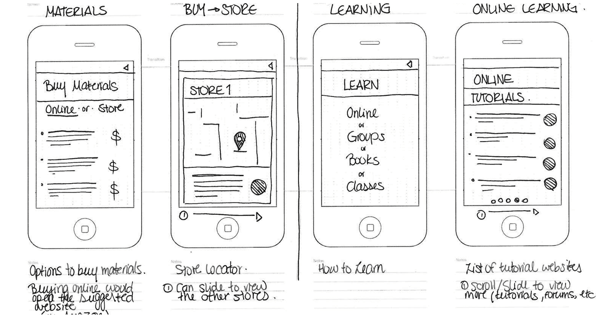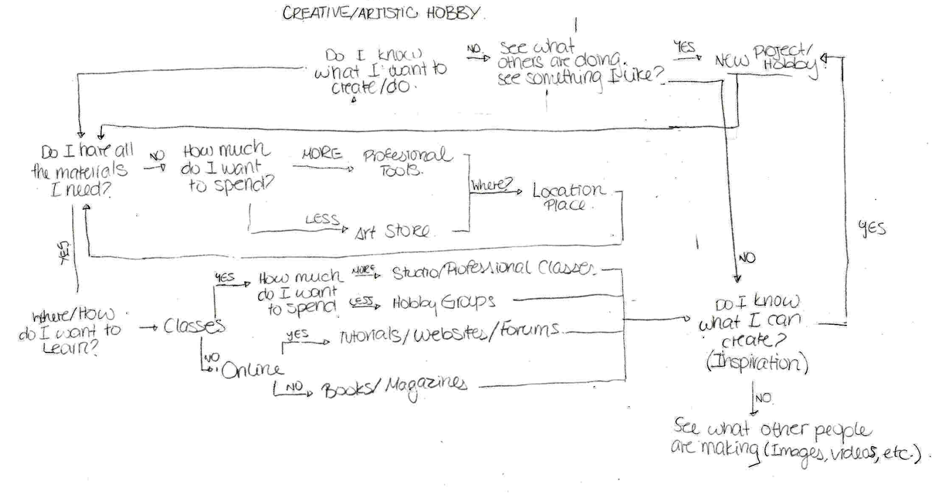 I began by analyzing the decision making process for pursuing a new hobby. I created a flow diagram of the thinking process and the questions that may arise throughout this process. It was important to incorporate possible answers for these questions. These answers helped me narrow down the functionality of the app.