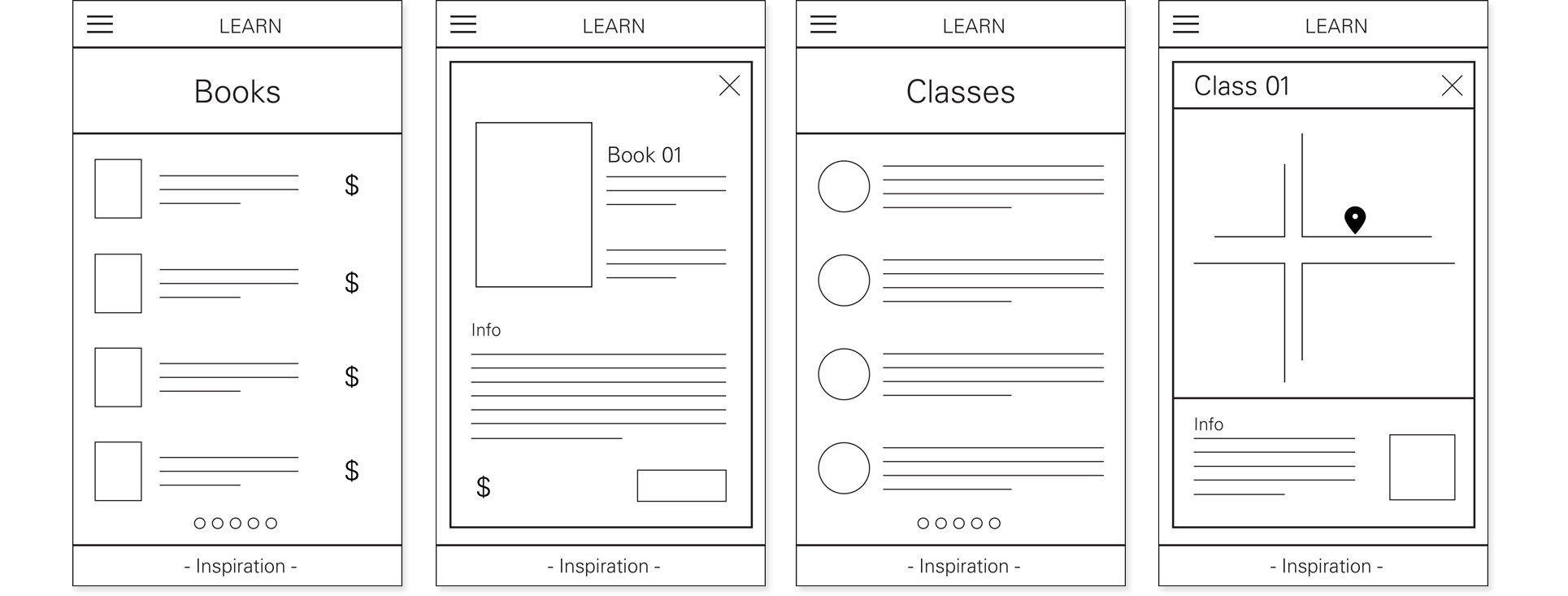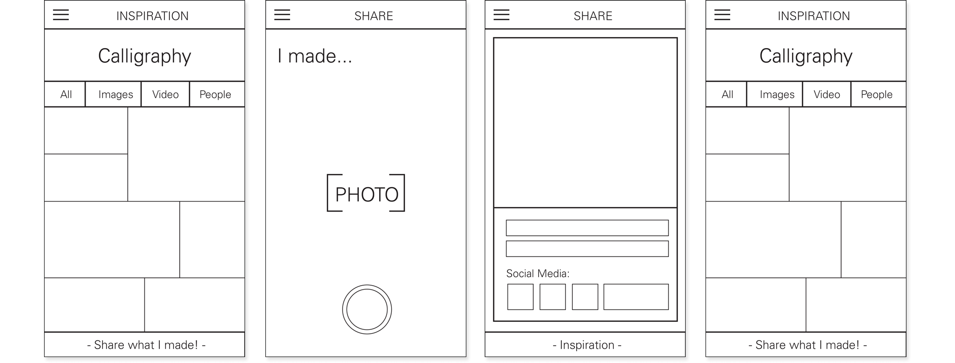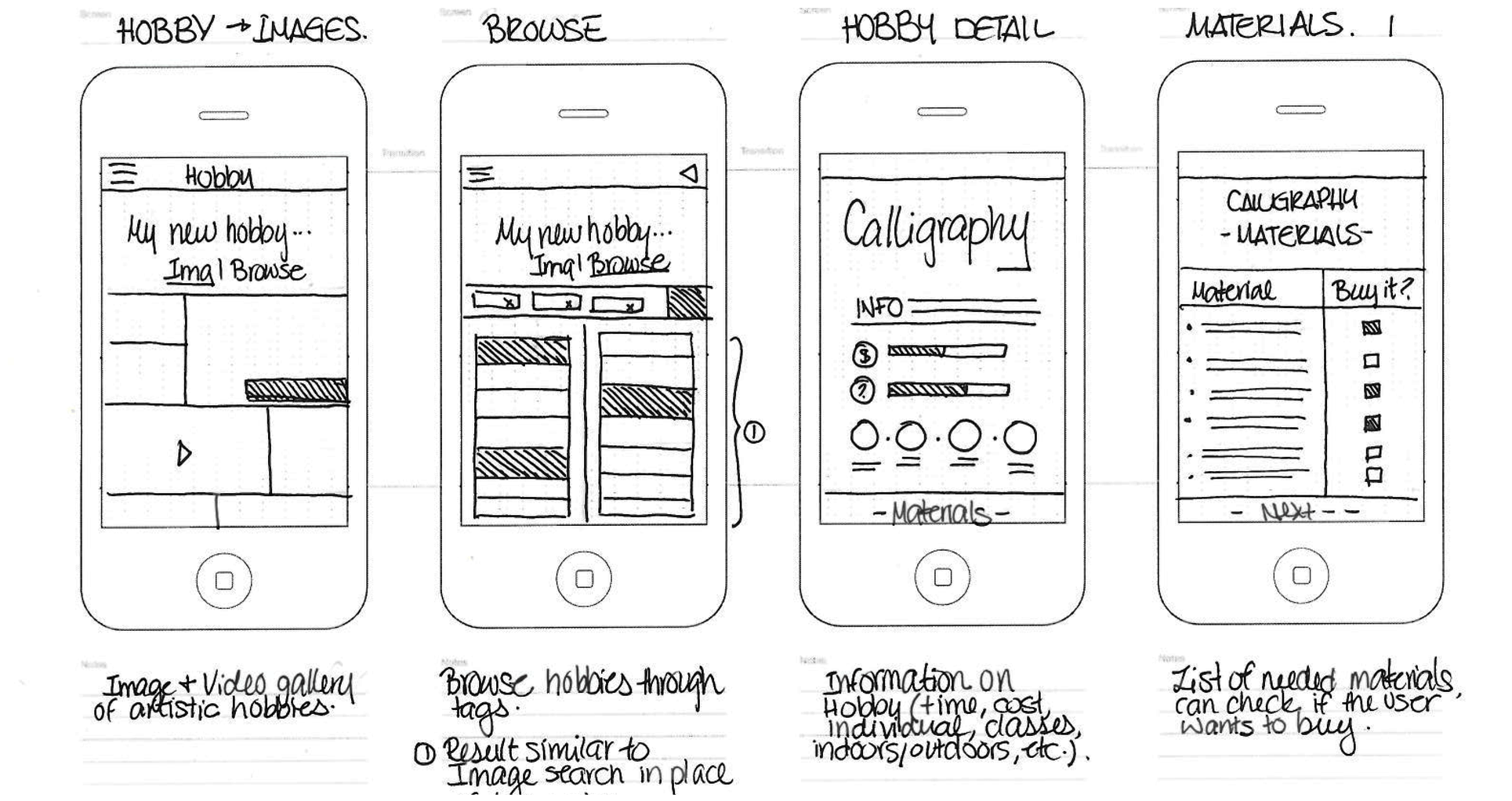 WBased on the user flow created in the previous stage, I created wireframes for the app. The user can browse through images for inspiration or use tags to obtain suggestions on a new hobby. After choosing a hobby, the user can learn about the hobby and what it entails. He or she can also view what materials are necessary and where they can be purchased. If they need help in creating something new, the app shows different resources that can be of use. The app also allows the user to share what they have created and follow other users.